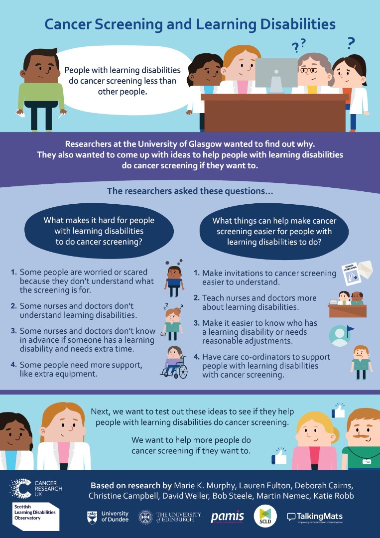 Cancer screening can save lives if people participate. People with learning disabilities participate in screening less often than other people. This project aimed to identify the barriers and facilitators people with learning disabilities face to accessing cancer screening and develop interventions to improve cancer screening access for people with learning disabilities in collaboration with people with learning disabilities, carers, and people in relevant professional roles.